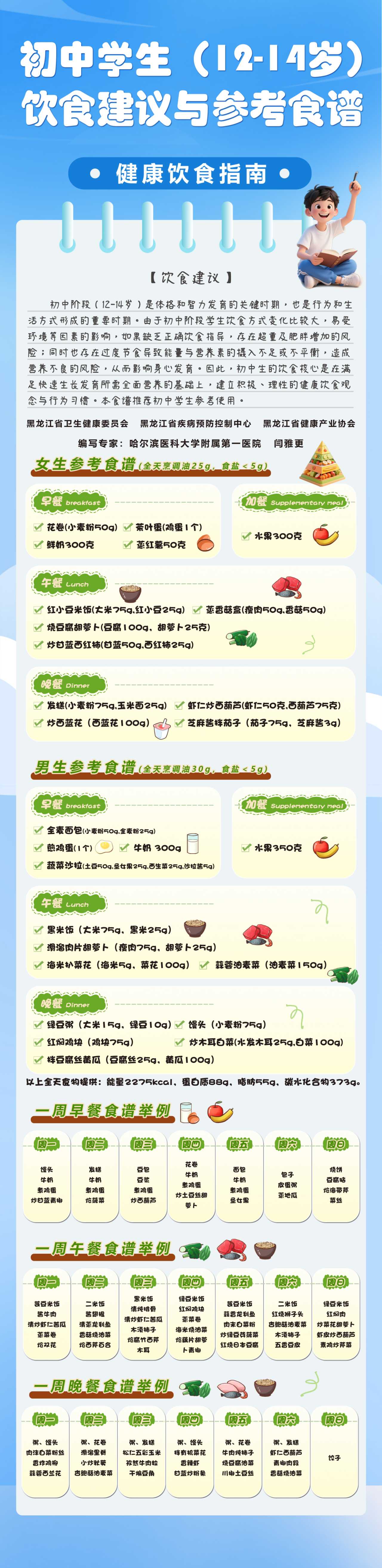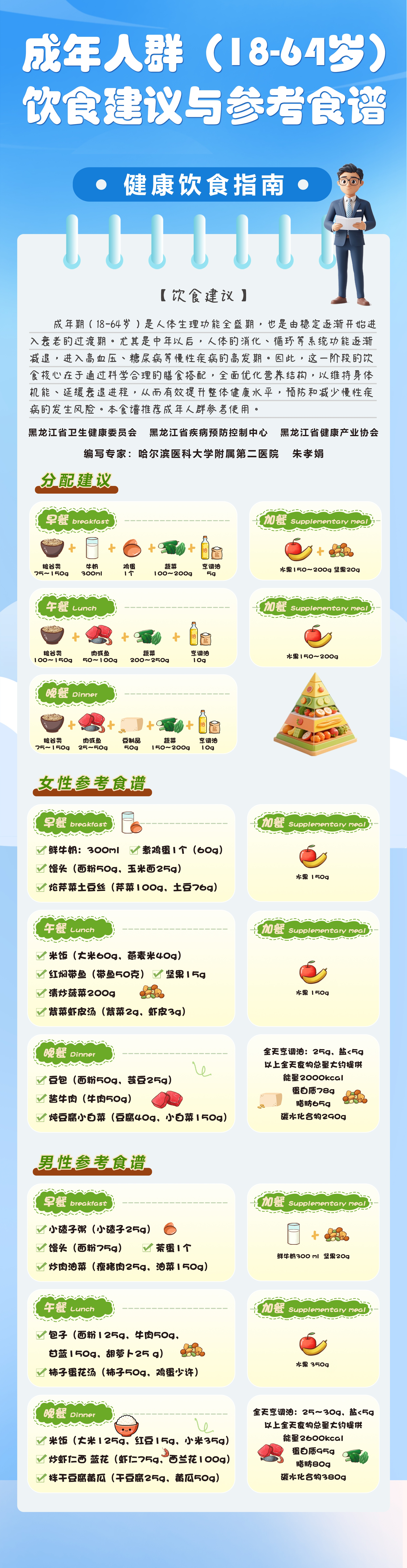 为持续推进《国民营养计划(2018-2030年)》和《健康龙江行动(2019-2030年)》之合理膳食行动,结合我省实际,进一步丰富面向全人群、全生命周期的营养健康服务,省卫生健康委组织编制了覆盖各年龄段、各类人群的科学饮食建议及参考带量食谱。同时,针对孕产妇、高血压、糖尿病、高脂血症、高尿酸血症、慢性肾病、成人肥胖、儿童青少年肥胖、儿童青少年生长迟缓等特殊人群,同步推出食材易得、直观可操作的一周带量食谱范例9大类16个专篇,为有需求的人们加强自身日常膳食管理提供参考和指引。