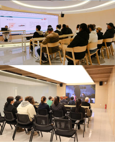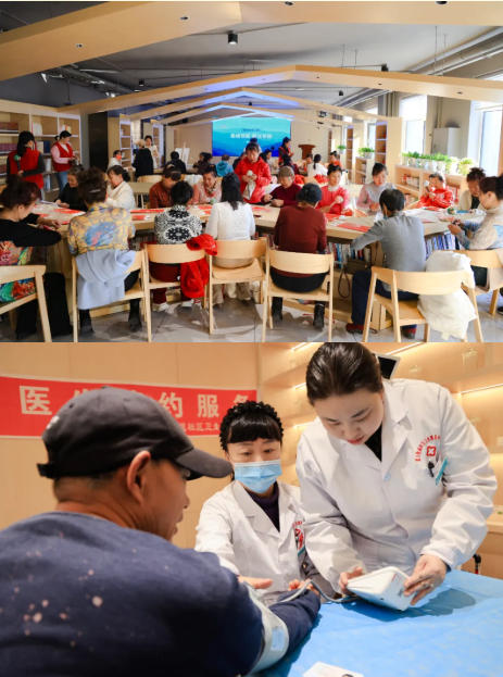 活动现场流程丰富多元,各环节在中心不同功能区有序开展。大厅设置5米长“重阳打卡板”,记录老人慈爱笑颜;一楼多功能厅迎来辖区文艺团体带来的精彩汇演,歌曲、舞蹈、快板等节目轮番上演,用艺术传递节日祝福;二楼区域则聚焦民俗体验与健康关怀。设置民俗体验环节,志愿者现场教授养生锤与香囊制作,从裁布缝袋、填充艾草到缠绕棉线,手把手指导参与者完成实用又具节日意义的手作;邀请医院专家开展健康讲座,为老年人科普健康知识;讲座结束后,同步开启义诊服务,医护人员为老年人提供测量血压、血糖、骨密度等检查,并解答健康疑问。此外,还放映了以“敬老、温情、思念”为主题的影片,用影像温暖人心,促进代际情感交流。