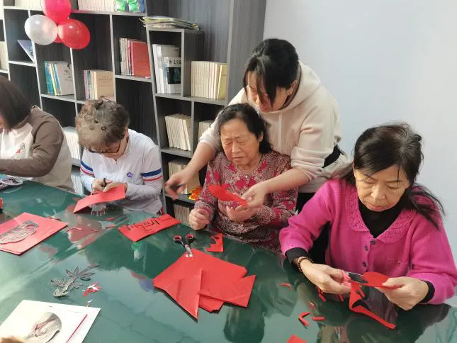 居民将自己手中选好的彩纸进行折叠、裁剪。在大家的努力下,一张张红彤彤的窗花、春字、福字等图案作品跃然呈现,看着自己的“杰作”,居民脸上洋溢着开心幸福的笑容。
