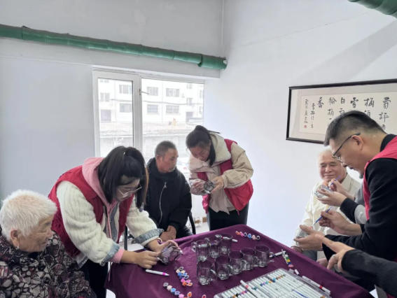 活动中,“包饺子小分队”围坐在一起,揉面、擀皮、调馅、包捏,动作娴熟又默契。与此同时,手工志愿者与老人围坐一圈,共同制作手工杯。
