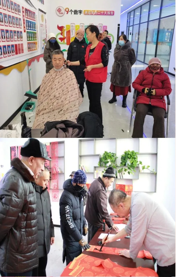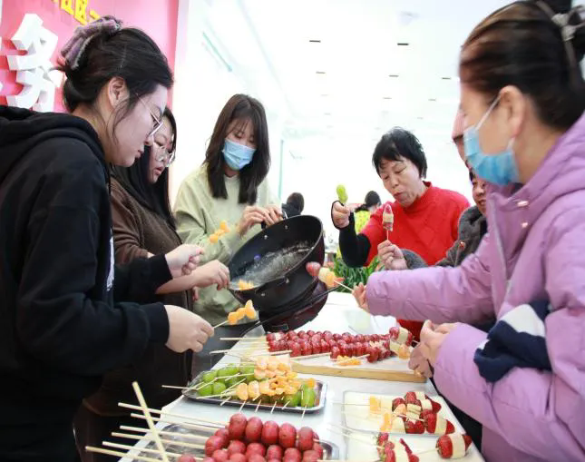 爱心义剪区域,专业的理发师志愿者们早早准备就绪,耐心地为每一位前来的居民修剪头发。写春联、画福字区域则墨香四溢,银发党员们或挥毫泼墨,或精雕细琢,一副副寓意吉祥的春联、一张张饱含祝福的福字在笔下诞生,为大家送去新春祝福。在制作糖葫芦的摊位前,社区工作人员与居民朋友将一颗颗红彤彤的山楂裹上晶莹剔透的糖衣。不一会儿,酸甜可口的糖葫芦就制作完成了,居民们拿着糖葫芦,脸上洋溢着幸福的笑容,现场充满了欢声笑语。