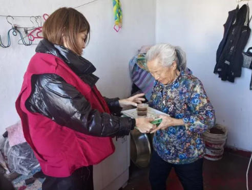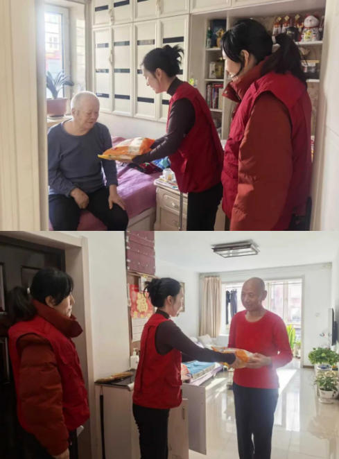 工作人员每到一户,都了解其生活近况与需求,并将饺子递到他们手上,感受到党组织的关怀。