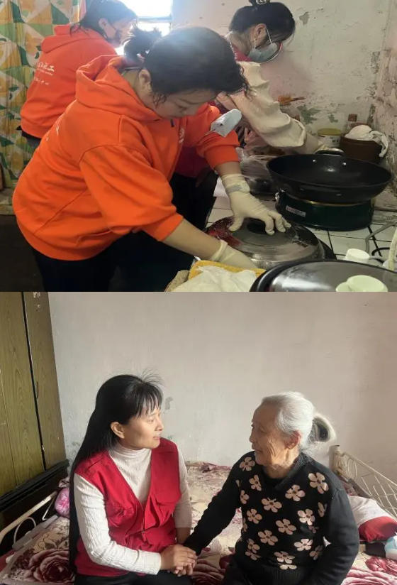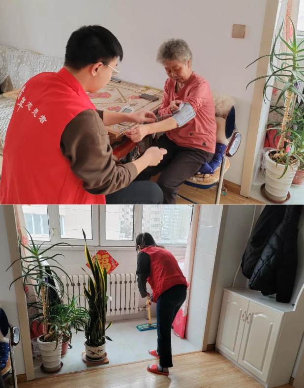 在独居老人家中,志愿者细心为老人修剪指甲、测量血压,详细了解老人的身体状况和日常生活需求,叮嘱老人注意季节变化、保重身体。同时,帮助老人打扫房间、整理家居、清扫环境卫生,让家中变得干净整洁、温馨舒适。