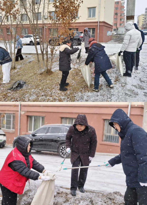 活动当日,大家一同对包保小区内的残冰积雪、卫生死角等处的白色垃圾进行集中清理,在清理过程中,大家分工明确、相互协作,志愿者仔细捡拾垃圾,辖区环境卫生面貌焕然一新。