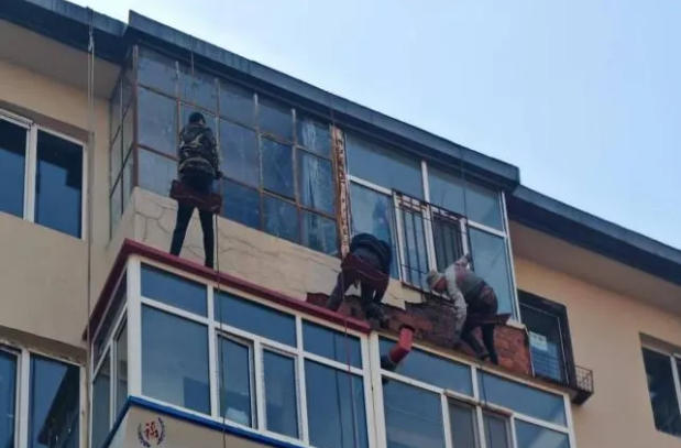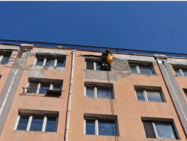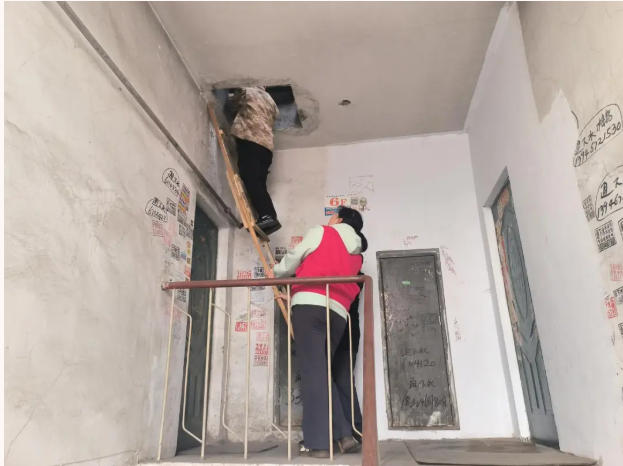 为确保施工期间居民安全,社区工作人员在隐患区域周边拉起警戒线、张贴醒目温馨提示,并通过网格群发布通知、入户上门告知等方式,提醒居民绕行避让。施工人员利用高空作业设备,对空鼓、松动的墙皮进行彻底铲除。经过连续作业,所有隐患墙皮被全部清理干净。